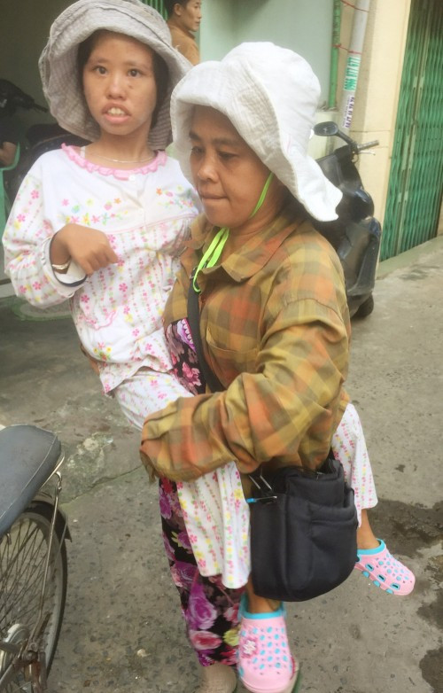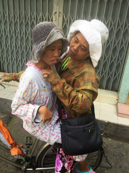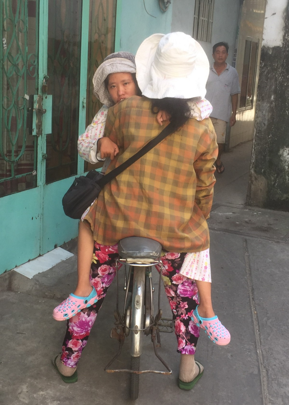 Chị bế Tiên Đào lên yên xe phía trước, quay mặt ra sau. Chị ngồi lên ba-ga sau chống tay về phía trước để lái và cũng để ôm lấy Tiên Đào. Hai mẹ con bắt đầu một ngày mới. Hình ảnh cô con gái bệnh tật ôm chặt lấy mẹ khiến chúng tôi không khỏi nao lòng…