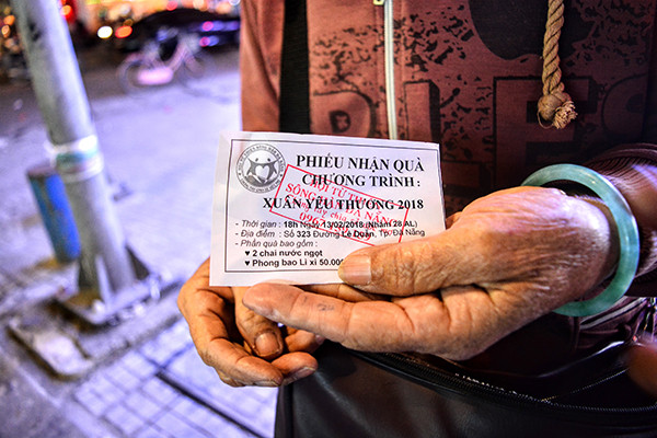 Để số tiền và quà đến tay những hoàn cảnh khó khăn nhất, trước đó, những người bạn trong hội đã đi phát phiếu nhận quà, hẹn các cô chú lao động nghèo tập trung tại một số địa điểm trên đường: Nguyễn Chí Thanh, Lê Duẩn, trước UBND phường Nại Hiên Đông (quận Sơn Trà), để nhận những món quà sẻ chia trong ngày cuối năm giá lạnh.