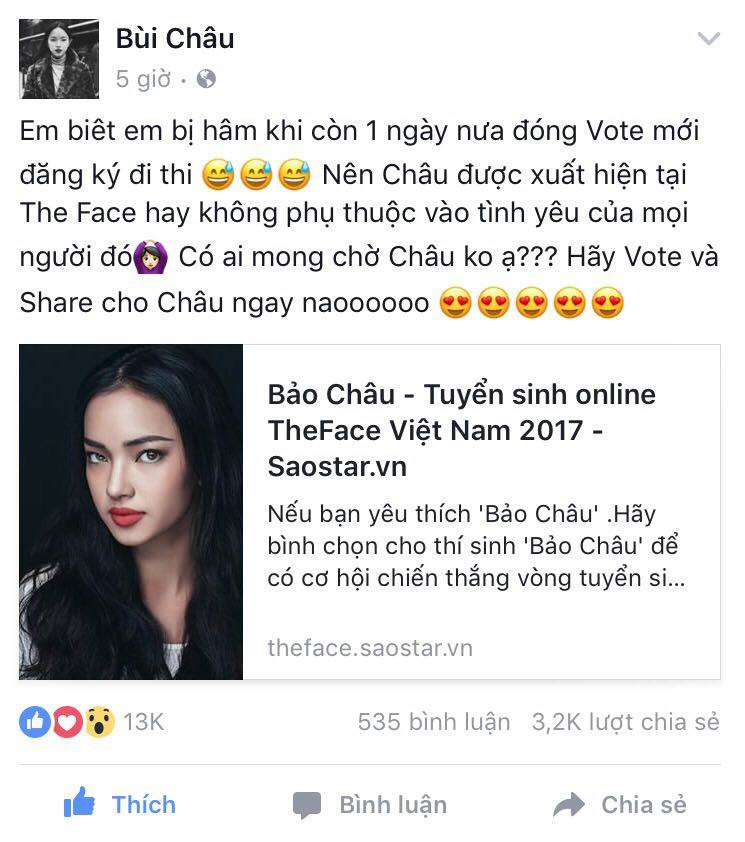 Sáng nay, trên trang cá nhân của mình, Bảo Châu (hay còn gọi là Châu Bùi hay Chou Chou) đã đăng dòng trạng thái chia sẻ thông tin cô quyết định ghi danh vào cuộc thi The Face Online. Ngay lập tức, thông tin này được người hâm mộ của cô hết sức quan tâm, gửi lời chúc mừng và chia sẻ rầm rộ trên facebook với nhiều ý kiến tích cực, ủng hộ hết mình.