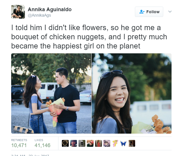 Rico Villanueva - chàng "gà bông" cực kì lãng mạn và sáng tạo của Annicka Aguinaldo đã dành tặng cho cô một bó hoa làm từ... gà viên, chỉ bởi Annicka đã từng thổ lộ với bạn trai mình từ những ngày đầu khi bắt đầu mối quan hệ của hai người rằng cô không hề thích hoa.