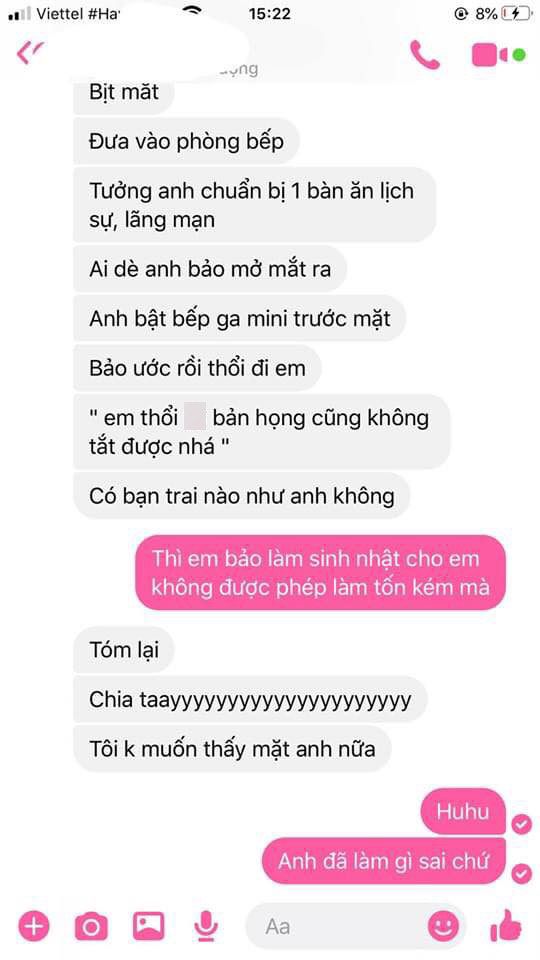 Đến đây chàng trai lại cho rằng mình không làm gì sai, bởi cô gái từng nói rằng không muốn làm sinh nhật tốn kém. Anh chỉ thực hiện y xì mong muốn của người yêu thôi mà.