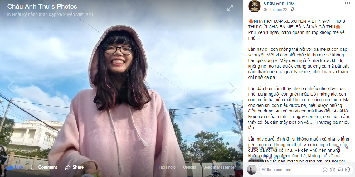 Chị Thư có chia sẻ về chuyến đi của mình trên Facebook theo từng chặng đường. Khi đến Phú Yên - quê của chị, một tỉnh ở miền Trung, chị có viết một bài gửi cho ba mẹ mình, có đoạn như sau: "Lần đầu tiên cảm thấy nhớ ba nhiều như vậy. Lúc nhỏ, ba là người con ghét nhất. Có những lúc, con còn muốn ba biến mất khỏi cuộc sống của mình. Mãi cho đến khi con hiểu được ba, hiểu được những điều ba đang làm và ba vì con mà thay đổi cả cái tôi kiêu hãnh của mình. Từ ngày con lớn, con luôn cảm thấy có lỗi, cảm thấy biết ơn và .... Thương ba nhiều lắm (...)