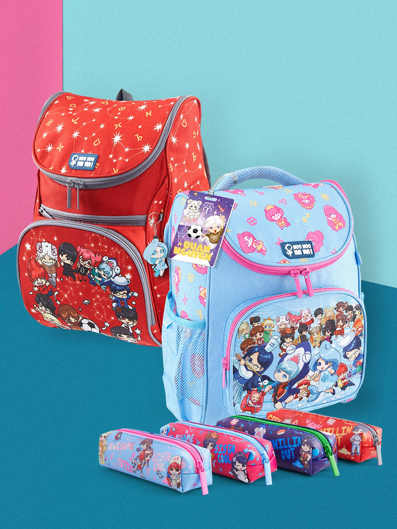 Ba lô mà Bảo An đeo thuộc nhóm Cyan Intelligence, có màu xanh da trời ngọt ngào phối cùng hình chibi các cung hoàng đạo màu hồng đáng yêu muốn xỉu! Trông chiếc ba lô như một mảnh biển mát rượi của mùa Hè vậy.