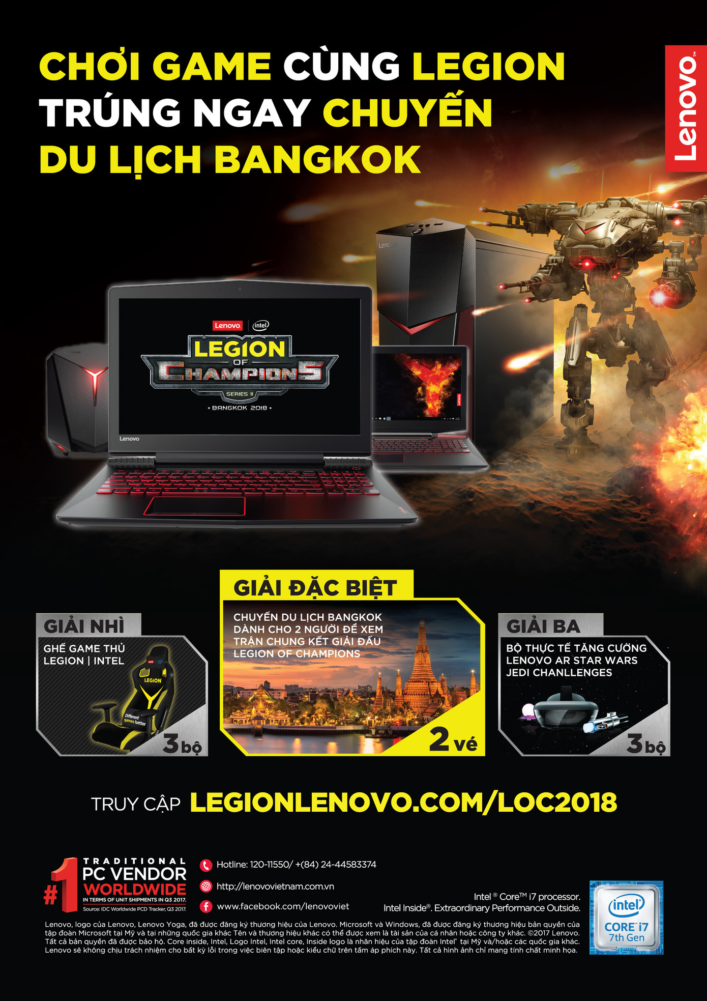 Theo đó, khách hàng khi mua sản phẩm máy tính xách tay dòng game Lenovo Legion Y520 hoặc Y720 chính hãng của Lenovo trên thị trường Việt Nam sẽ có cơ hội nhận được một cặp vé máy bay khứ hồi đến Bangkok, được đài thọ chi phí khách sạn và một cặp vé VP xem trận Chung kết giải đấu Legion of Champion II sẽ diễn ra tại Bangkok từ ngày 26 - 28/1/2018. Bên cạnh đó, cuộc thi Lenovo Legion II này còn có loạt giải thưởng khác cũng làm mê lòng game thủ Việt, bao gồm ghế chơi game Lenovo - Intel đầy cá tính, hay bộ headset thực tế ảo tăng cường Lenovo AR “Star Wars Mirage” giúp bạn có thể nhập vai nhân vật trong tựa game ăn theo bộ phim đình đám Star Wars.