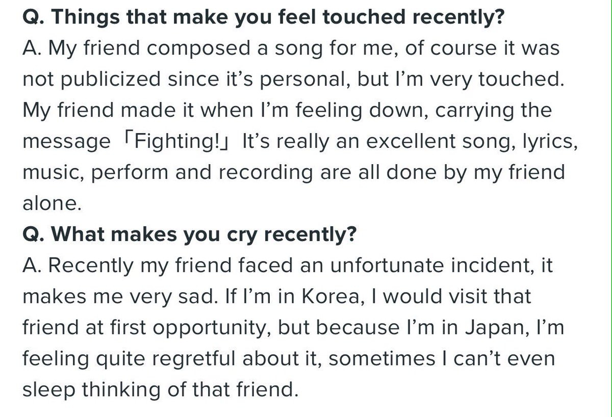 Cũng trong bài phỏng vấn này, Jiyeon cũng chia sẻ bản thân đã rất buồn và thậm chí không ngủ được vì một người bạn của mình vừa gặp một sự cố không mong muốn. Nhưng tại thời điểm đó, Jiyeon không thể gặp mặt và an ủi người bạn này được vì cô phải tham gia các hoạt động âm nhạc tại Nhật Bản. Quan trọng là bài phỏng vấn này được thực hiện vào tháng 11/2012, ngay sau thời điểm scandal của IU và Eunhyuk (Super Junior) nổ ra nên các fan cũng phần nào đoán được người bạn mà Jiyeon nhắc đến là ai.