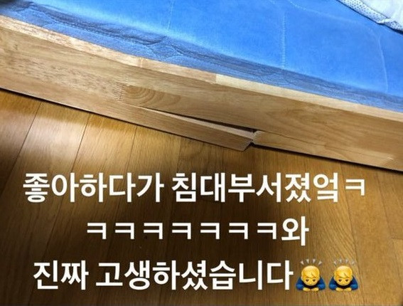 Và chẳng hiểu Kim Dong Han nhảy nhót tưng bừng thế này mà làm gãy luôn cả giường nhà mình. Anh chàng thậm chí còn hào hứng chụp ảnh khoe chiến tích với các fan. Chắc hẳn sau màn ăn mừng này, Kim Dong Han sẽ phải đi mua giường mới rồi.