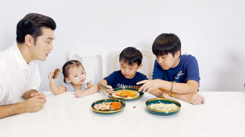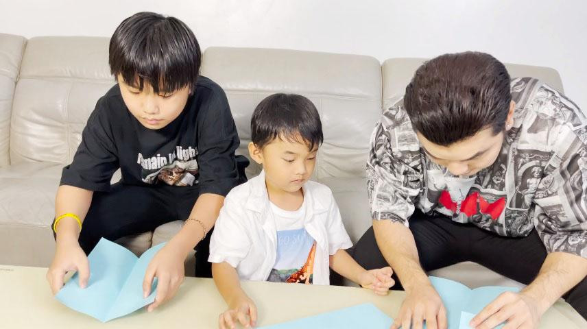 Nam ca sĩ đã có những khoảnh khắc vui chơi đáng giá cùng các con như: làm bánh pizza, gấp máy bay giấy… Có lẽ, đây là những hoạt động hiếm khi diễn ra tại gia đình do lịch trình dày đặc của Ưng Hoàng Phúc và bà xã Kim Cương.