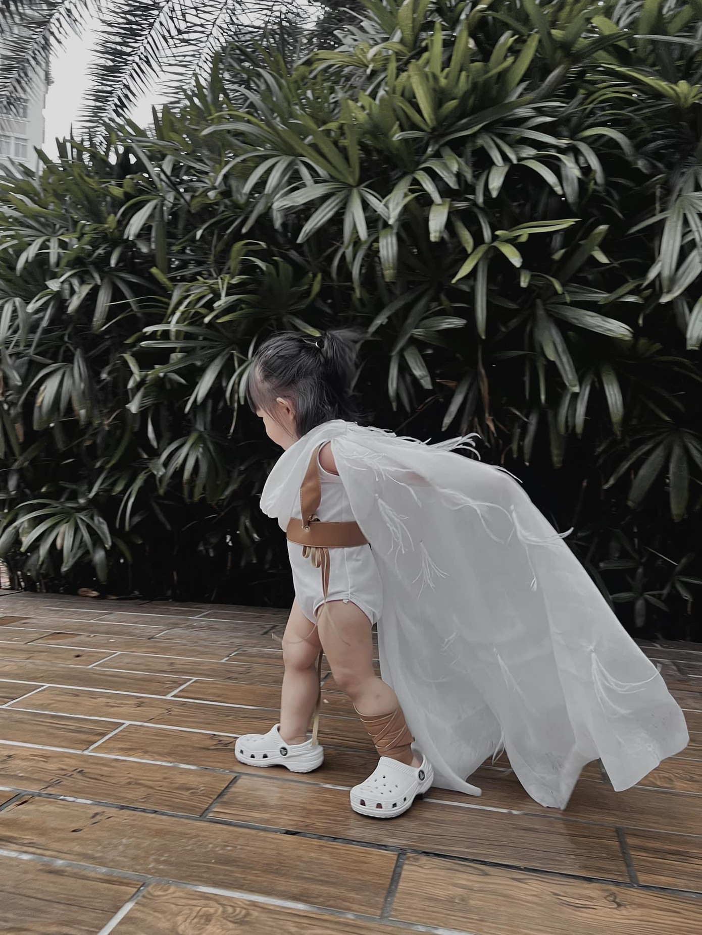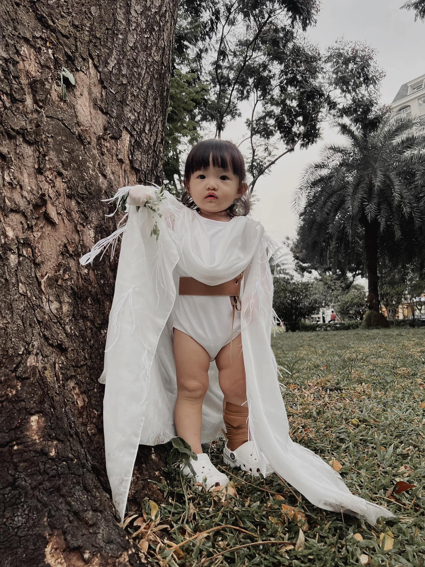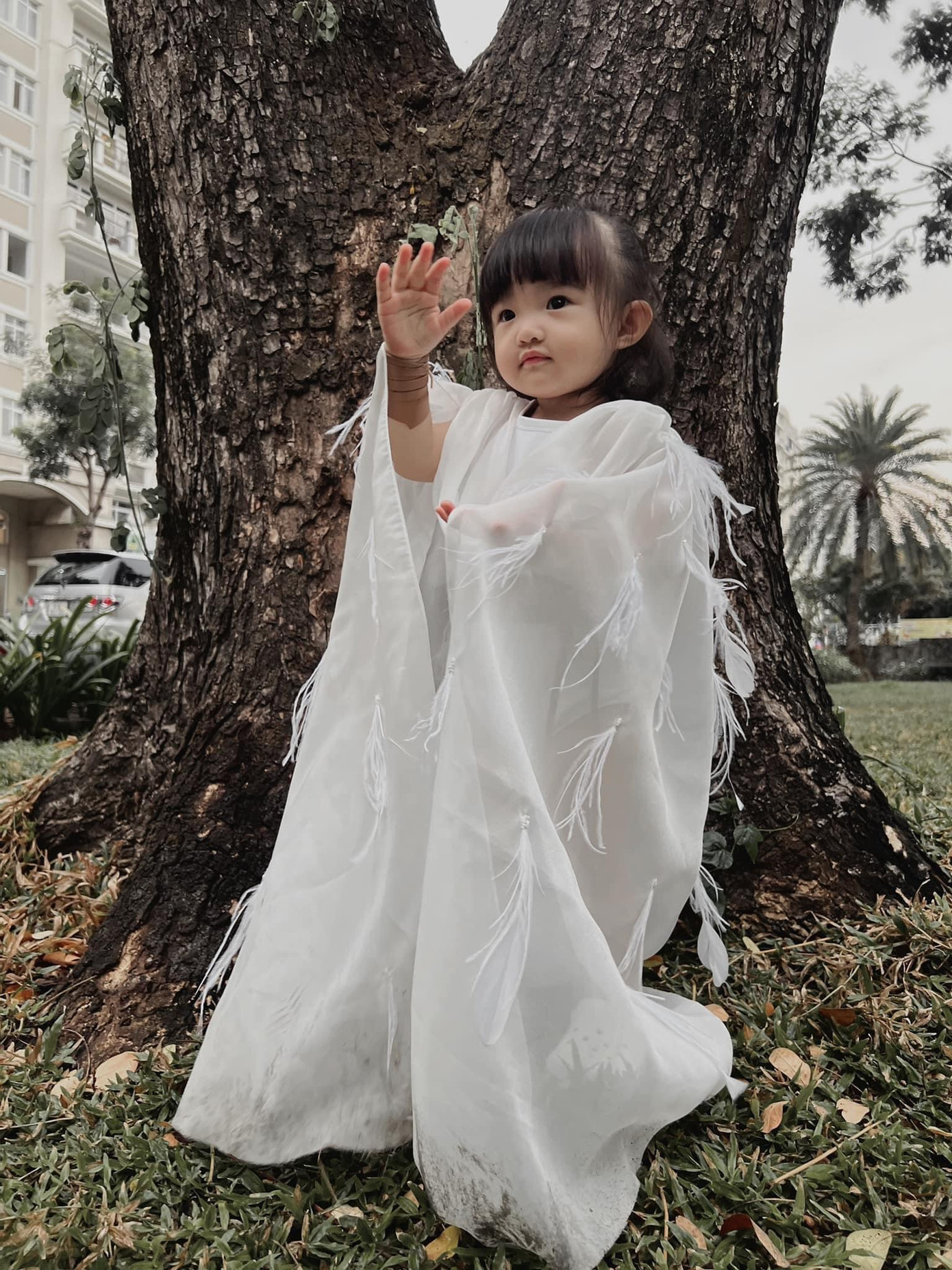 Mới đây, Đông Nhi đã đăng lên Facebook hình ảnh "thiên thần nhí" Winnie diện trang phục theo concept trong MV mới phát hành Đôi Mi Em Đang U Sầu của nữ ca sĩ. Cụ thể, bé Winnie diện áo trắng bên trong, choàng chiếc khăn cùng màu đính lông vũ bên ngoài và lấy thắt lưng da màu nâu làm điểm nhấn.
