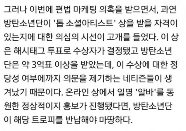 Vào cuối bài báo, phóng viên Jeon Won đã thêm một tuyên bố về chiến thắng của BTS tại Billboard Music Awards 2017: "Với những cáo buộc về tiếp thị bất hợp pháp, BTS bị nghi ngờ chưa đủ điều kiện để nhận được giải thưởng Top Social Artist. Người chiến thắng trong giải thưởng này được quyết định bởi hashtag vote và BTS đã nhận được hơn 300 triệu bình chọn. Nếu công ty thuê những nhân viên bán thời gian bình chọn để tăng phiếu bầu, thì công bằng mà nói, BTS nên trả lại chiếc cúp".