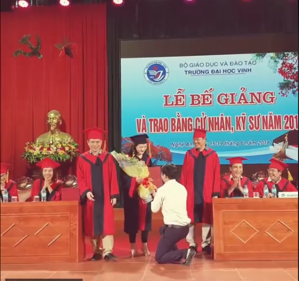 Ngay sau đó, thầy cầu hôn cô bạn trong sự ngạc nhiên của thầy cô giáo và các bạn sinh viên.