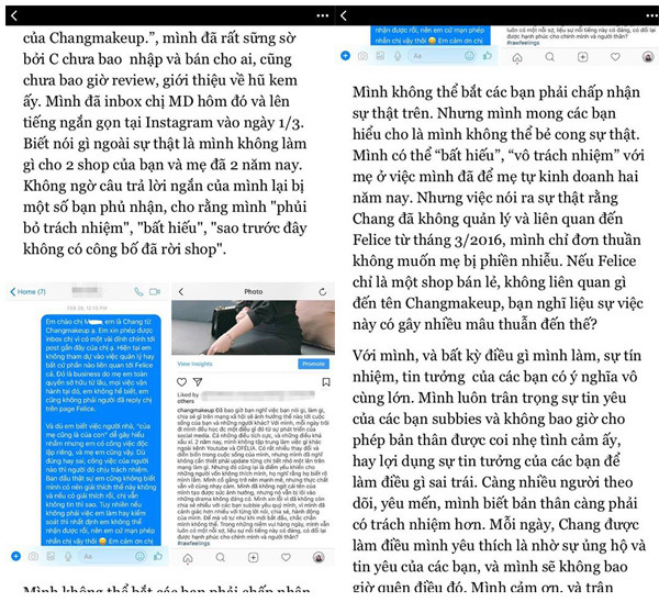 "Mình không bắt các bạn phải chấp nhận sự thật, nhưng mình mong các bạn hiểu cho là mình không thể bẻ cong sự thật. Mình có thể 'bất hiếu', 'vô trách nhiệm' với mẹ ở việc mình đã để mẹ tự kinh doanh hai năm nay. Nhưng việc nói ra sự thật rằng, Chang đã không quản lý và liên quan đến Felice từ 3/2016, mình chỉ đơn thuần không muốn mẹ bị phiền nhiễu" - cô chia sẻ trên trang cá nhân.