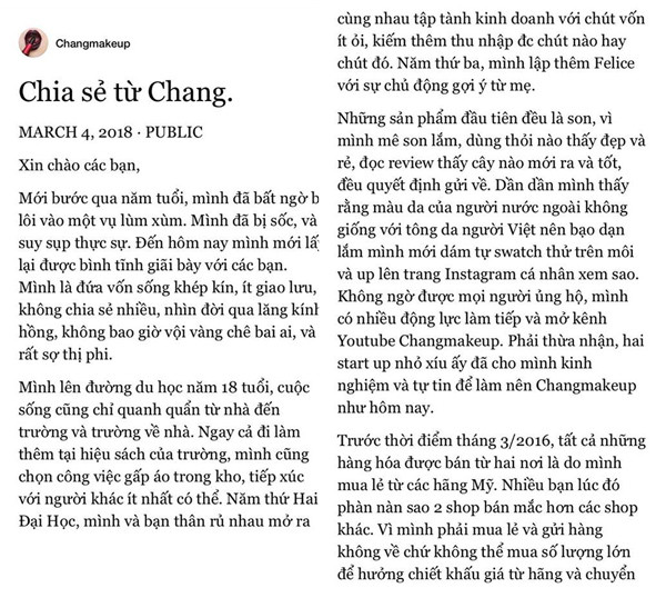 Trên fanpage của mình, Changmakeup vừa đăng một bài viết dài để kể rõ về lùm xùm trong những ngày qua.