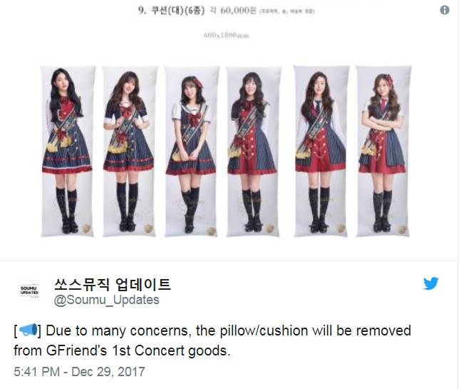 Trong khi đó, G- Friend gắn với hình ảnh trong sáng ngây thơ, không liên quan gì đến những chiếc gối kia cả. Chính vì thế mà ngay sau khi bị nhiều người phản đối, công ty Source Music đã phải gỡ bỏ mặt hàng này và thông báo không bán gối dài nữa.