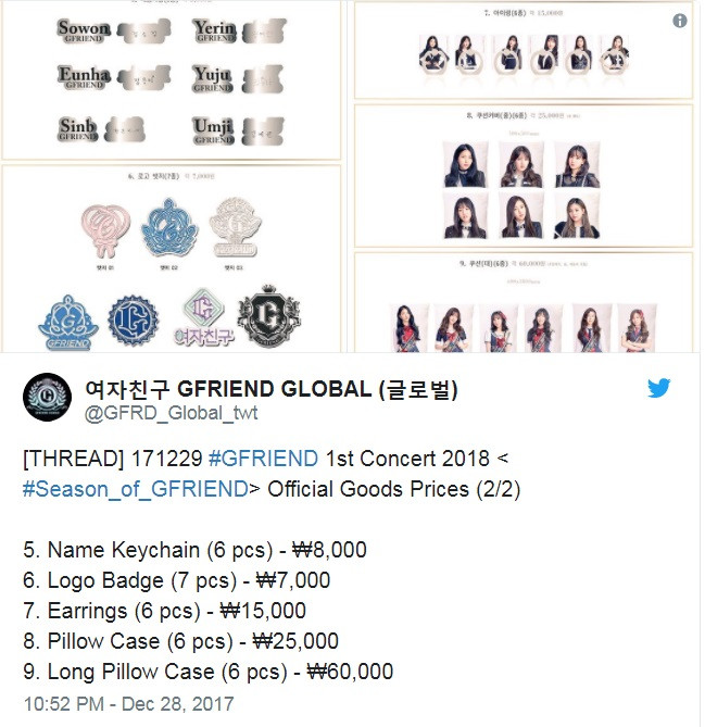 G-Friend đang chuẩn bị tổ chức concert đầu tiên trong sự nghiệp vào hai ngày 6 và 7/1/2018, và nhân dịp này công ty quản lý Source Music đã mở bán rất nhiều vật phẩm lưu niệm có liên quan đến concert.