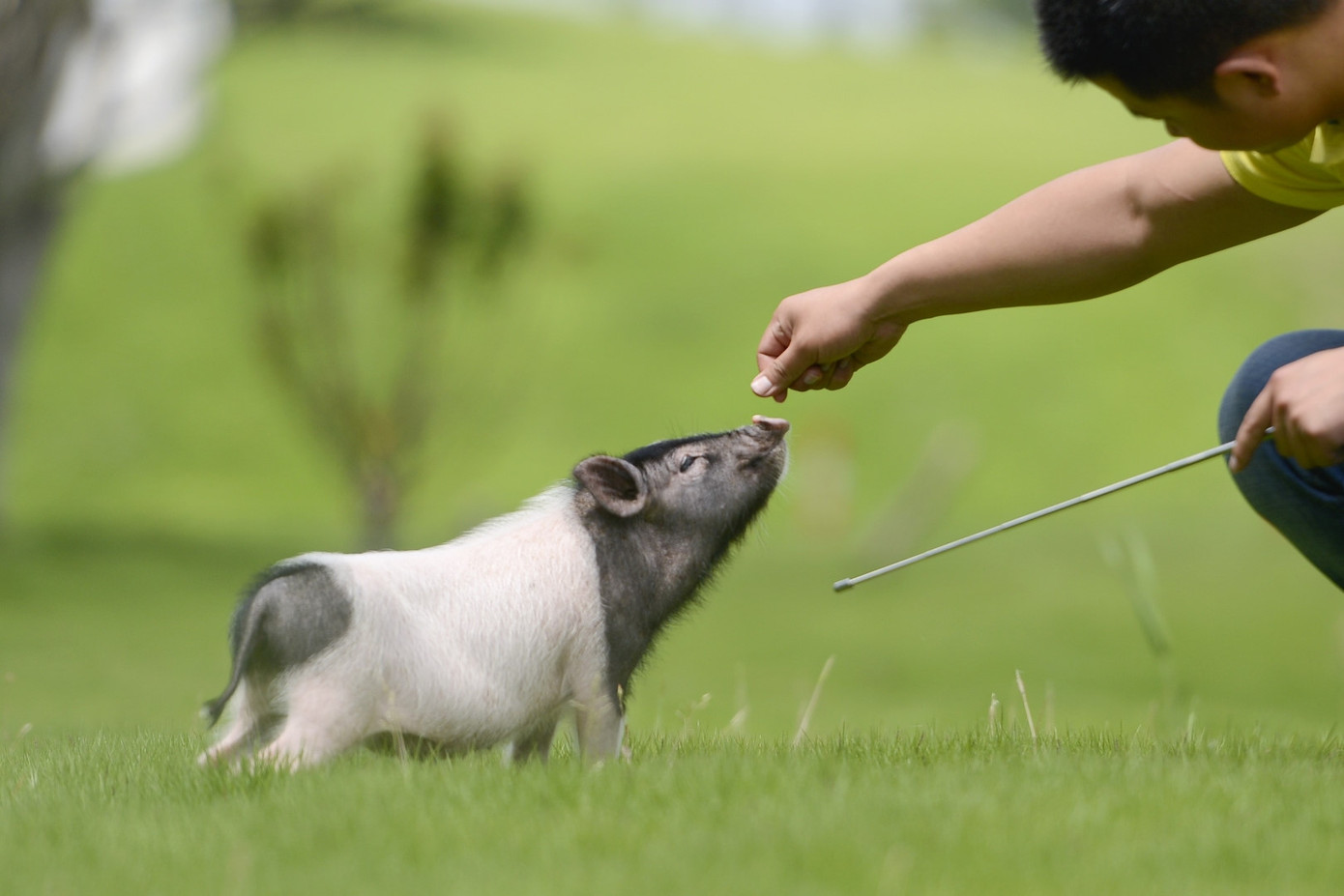 Một chú lợn con được huấn luyện viên thưởng đồ ăn trong buổi huấn luyện tại công viên. Mỗi chú lợn cũng được đặt tên riêng.