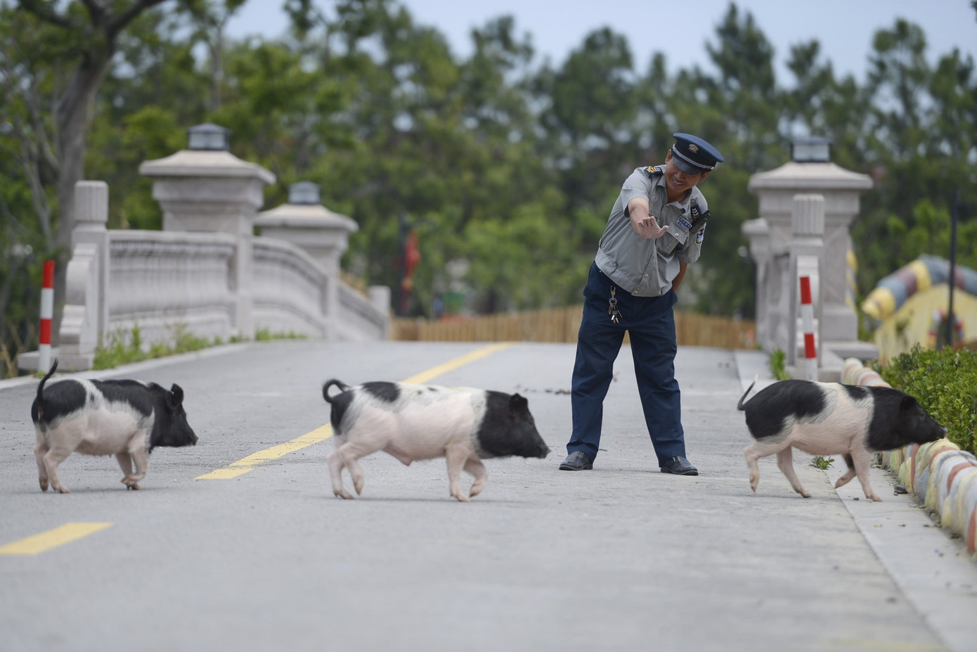 Nhân viên an ninh vẫy tay chào những chú lợn đang băng qua đường trong công viên "Hành tinh Lợn". Đàn lợn ở đây rất được trân trọng và yêu mến, đặc biệt khi năm mới Kỷ Hợi đến gần, lợn trở thành con vật mang lại may mắn và no ấm sum vầy theo niềm tin của nhiều quốc gia châu Á.