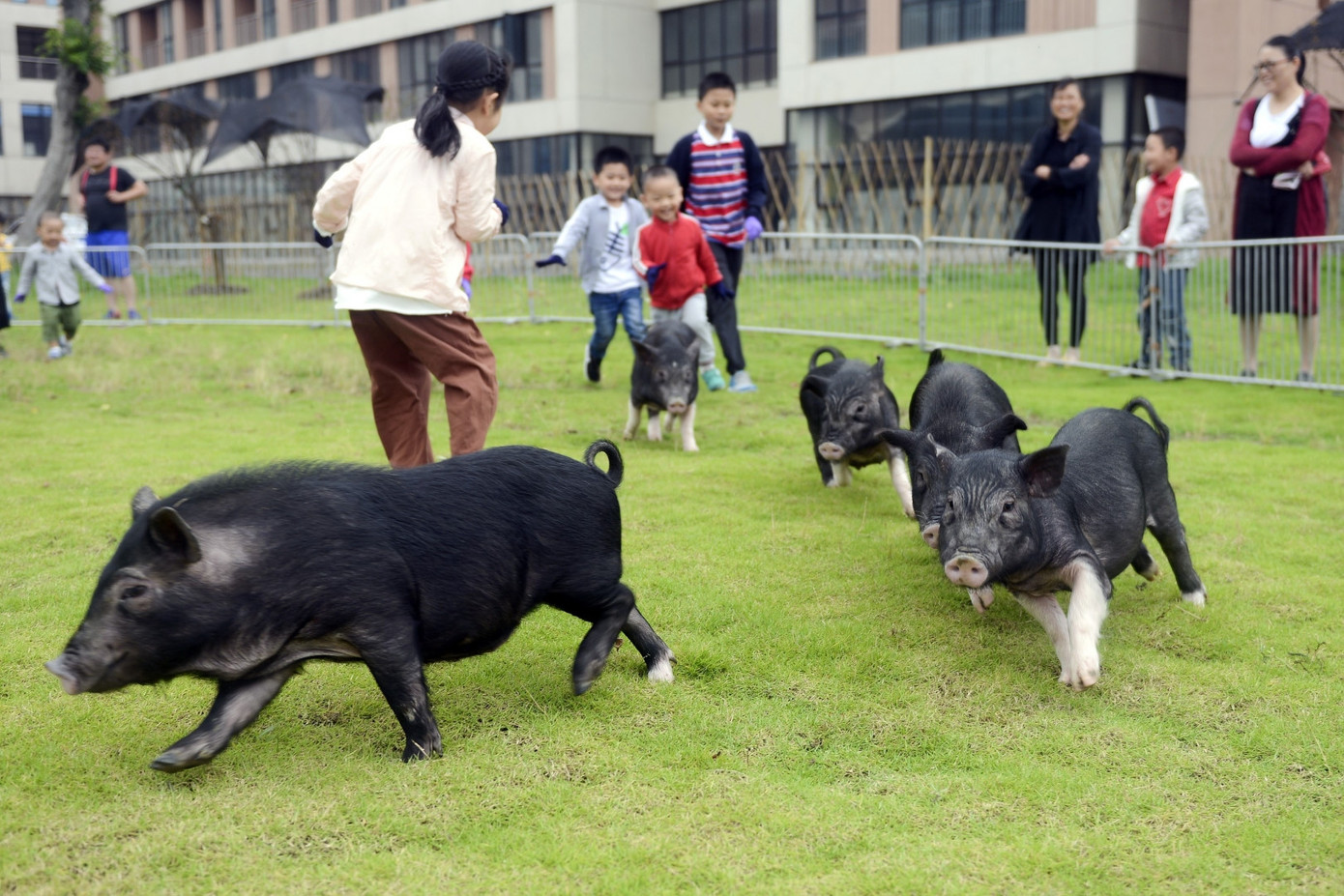 Trẻ em chơi đùa cùng đàn lợn trong công viên. Để tạo nên mối liên kết thân mật với những chú lợn, các huấn luyện viên ở đây sử dụng phương pháp hết sức đặc biệt: đem đàn lợn vào nhà ở cùng người. Mỗi tối, các huấn luyện viên ngủ trong phòng ngủ, còn đàn lợn ở ngoài phòng khách. Vào buổi sáng, cả đàn lợn dậy sớm và đánh thức các huấn luyện viên.