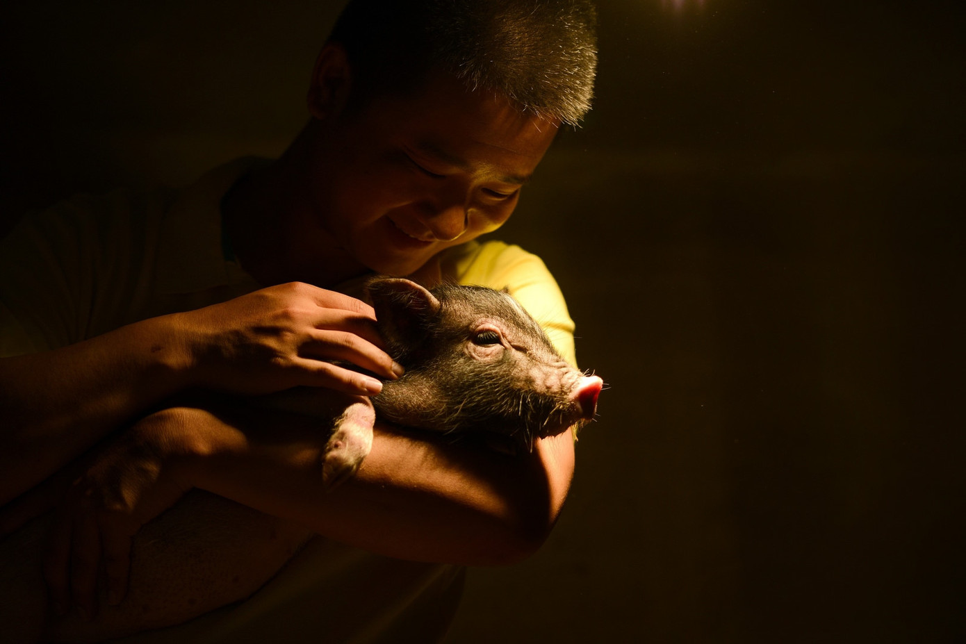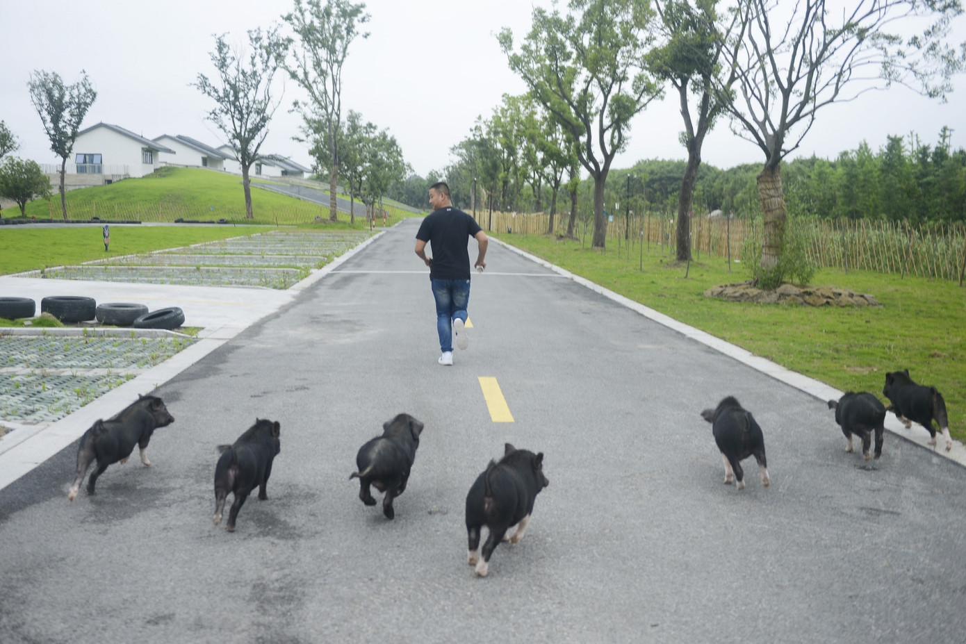 Đàn lợn đuổi theo Wang Xiaodong, huấn luyện viên tại công viên "Hành tinh Lợn". Từ cuối năm 2016, anh Wang bắt đầu công việc này với ba người cộng sự, huấn luyện những chú lợn đầu tiên dưới sự hướng dẫn của chuyên gia người Hàn Quốc.