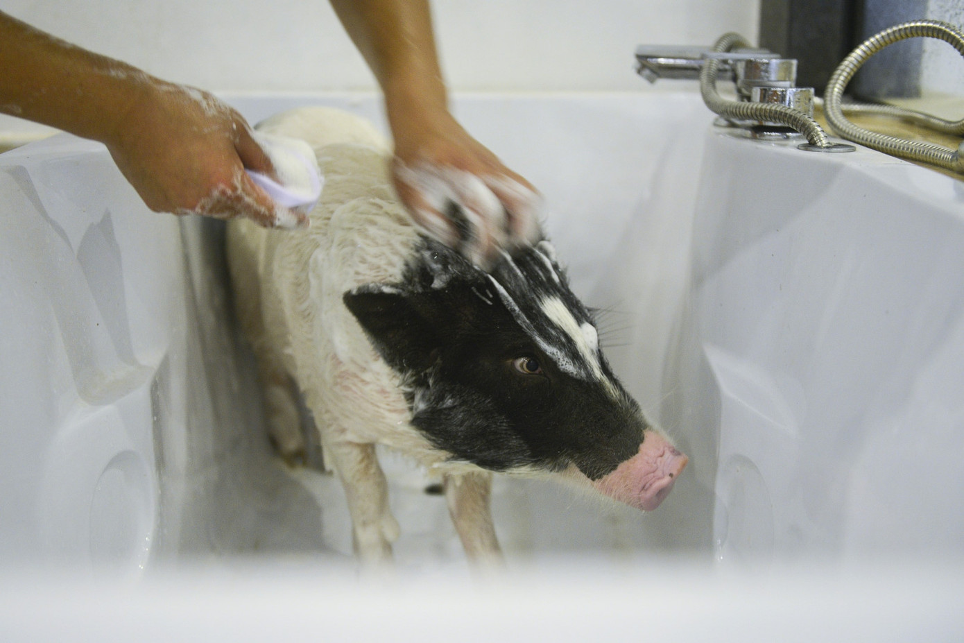 Huấn luyện viên tắm cho một chú lợn con tại công viên.