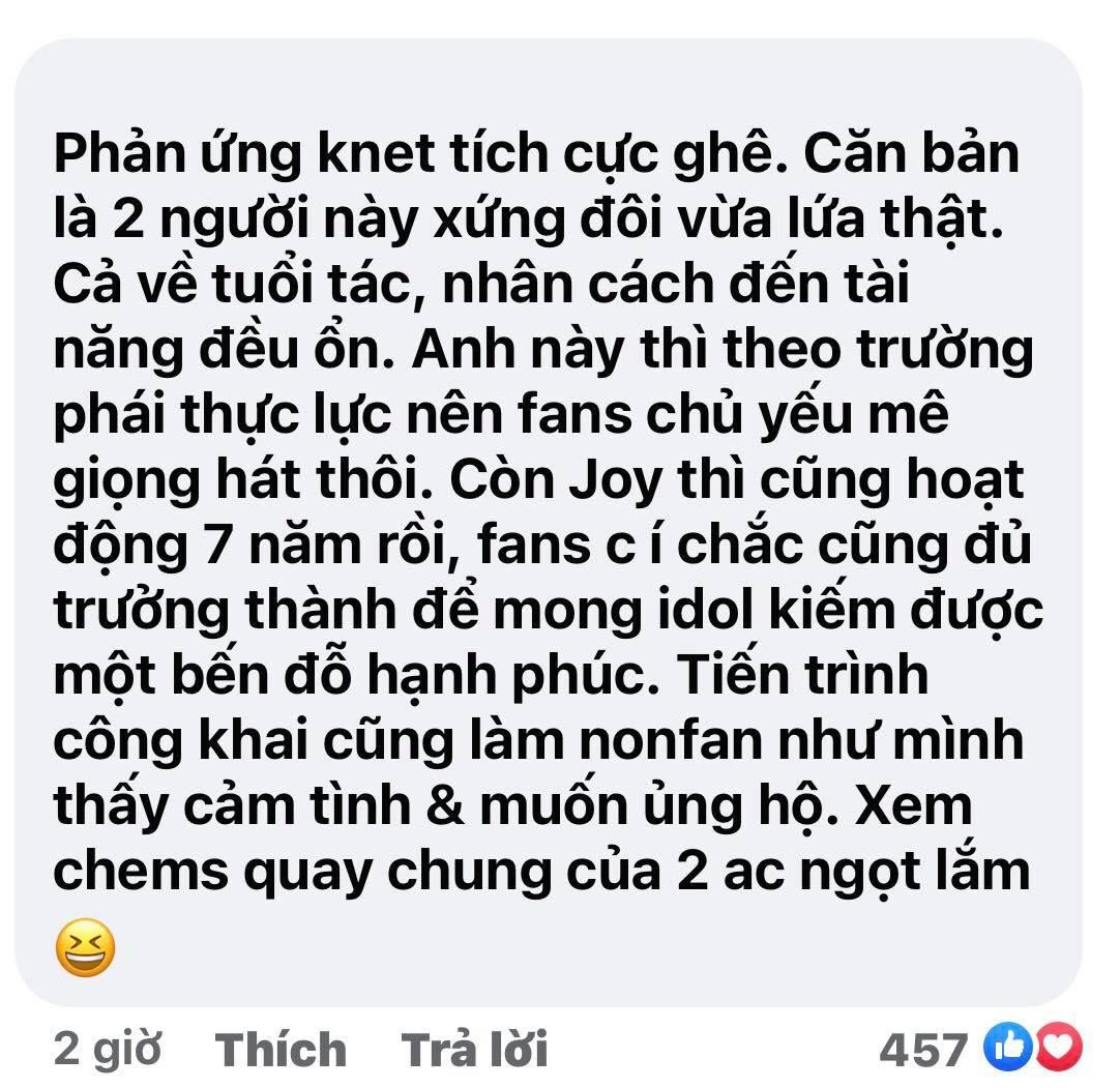 Joy đã bất ngờ đến mức bị sốc khi “mọi thứ diễn ra quá nhanh”. Trong khi Crush lại bình tĩnh hơn khi thể hiện nguyện vọng muốn được tự mình công khai mối quan hệ. Tuy nhiên, truyền thông đã nhanh hơn một bước khiến nam ca sĩ không kịp trở tay.