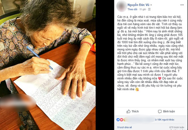 "Các bạn ạ, ở gần nhà mình có trung tâm bảo trợ xã hội, hè đến cũng là mùa xoài, mùa sấu nên mình cùng mấy đứa trẻ con hàng xóm vào đó vặt. Tình cờ thấy cụ ngồi vẽ vẽ mấy hình trái tim, mình mới hỏi bà đang làm gì đó ạ, bà mới bảo: "Hôm nay là sinh nhật chồng bà, nhớ không nhầm thì ông ý cũng phải được 105 tuổi mà ông ấy mất cách đây 8 năm rồi, giờ ngồi vẽ đủ 1000 trái tim đốt xuống cho ông ý, để ông biết trên này bà vẫn nhớ ông nhiều.