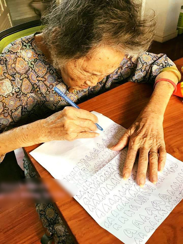 Cụ bà cặm cụi ngồi vẽ những trái tim nghuệch ngoạc nhưng đầy ắp tình cảm chân thành.