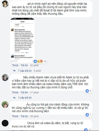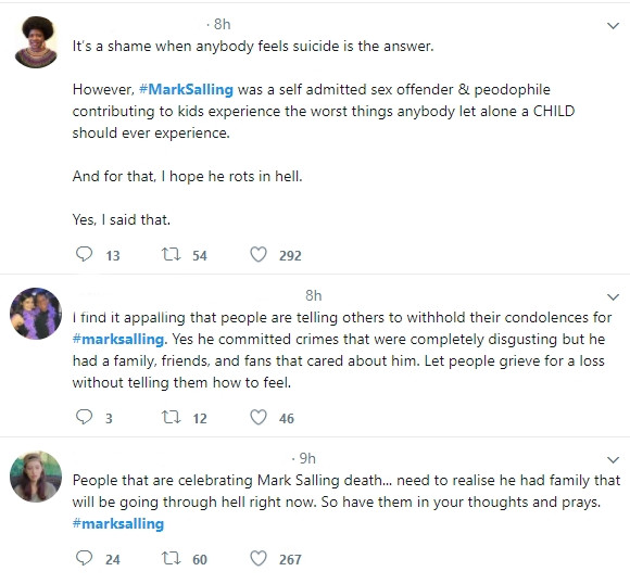"Tôi thấy thật kinh khủng khi người ta đang bảo chúng ta đừng nên chia buồn với #Marksalling. Vâng, anh ta đã phạm những tội ác hoàn toàn ghê tởm nhưng anh ta có một gia đình, bạn bè, và những người hâm mộ quan tâm đến anh ta. Hãy để mọi người đau buồn vì mất mát, đừng dạy họ nên cảm thấy thế nào".