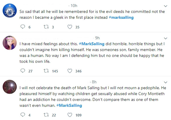 "Tôi sẽ không ăn mừng cái chết của Mark Salling nhưng tôi sẽ không thương tiếc một kẻ ấu dâm. Anh ta tự hài lòng với việc xem trẻ em bị lạm dụng tình dục trong khi Cory Montieth (diễn viên chính của Glee, qua đời năm 2013) không thể vượt qua cơn nghiện ma túy. Đừng so sánh hai người họ với nhau khi một người thậm chí không phải là con người. #MarkSalling"