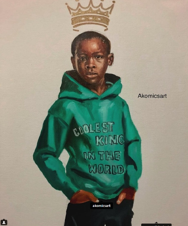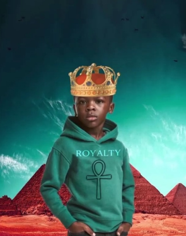 Một hình ảnh khác của em bé được vẽ lại, trông chững chạc người lớn hơn, với dòng chữ “Ông vua tuyệt vời nhất của thế giới”.