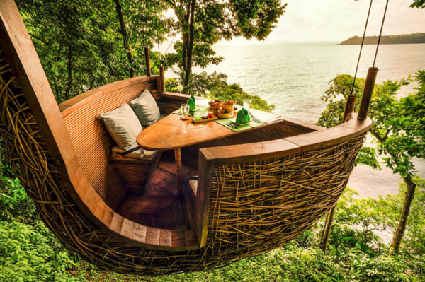 "Ăn trưa trong tổ chim? Tại sao không? - Đó hẳn là suy nghĩ của ông chủ nhà hàng này. Nhà hàng thuộc khu nghỉ dưỡng Soneva Kiri Eco ở Thái Lan. Chắc những người phục vụ ở đây không bao giờ cảm thấy chán khi họ luôn phục vụ khách hàng với sự trợ giúp của một dây kéo tới 3 “tổ” ở độ cao 16 ft (khoảng 4,8m).