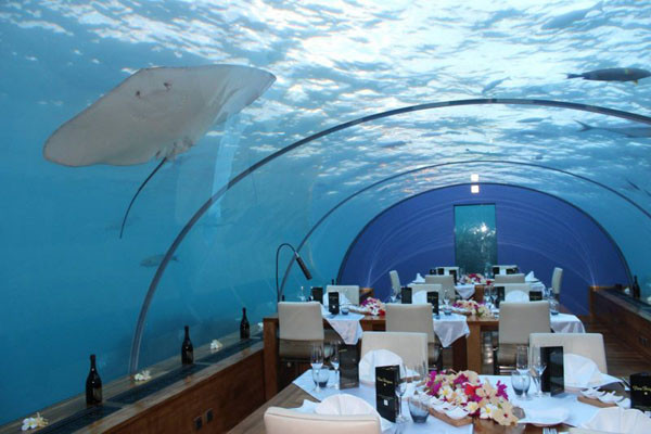 Bạn nghĩ sao nếu dùng bữa tối với cá mập, cá ngựa và rùa bơi xung quanh? Nếu bạn muốn thử cảm giác này thì hãy ghé thăm nhà hàng Ithaa ở Maldives, nằm dưới Ấn Độ Dương. Một lựa chọn hoàn hảo cho những người mong ước được chiêm ngưỡng thế giới dưới nước nhưng lại sợ hãi khi xuống nước.