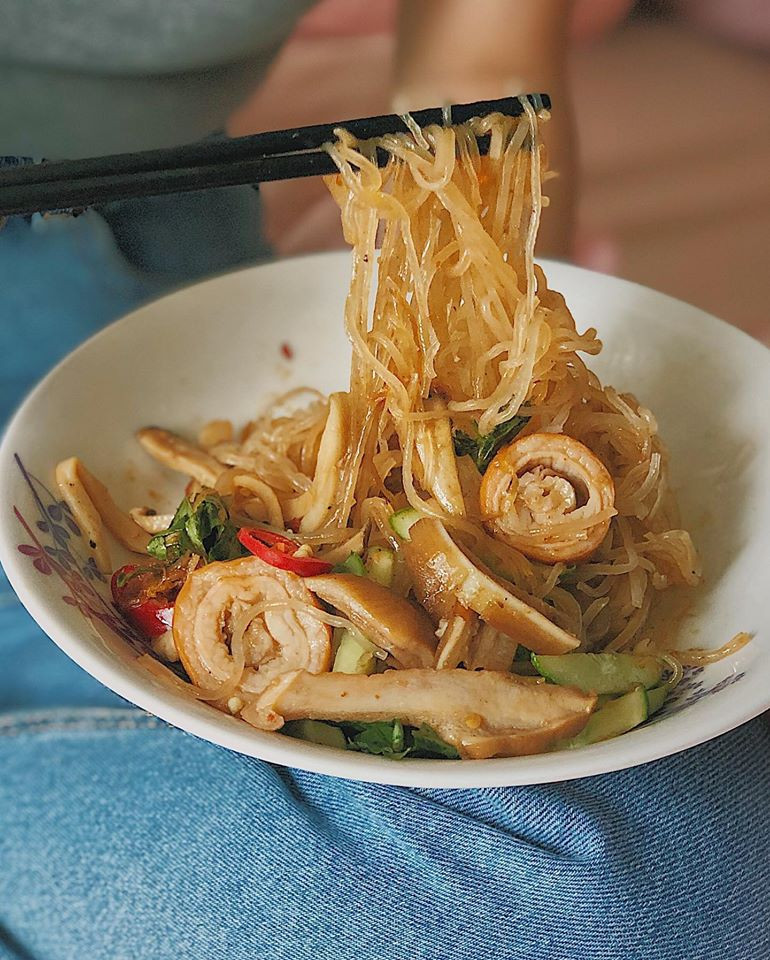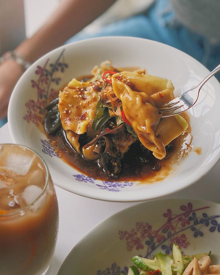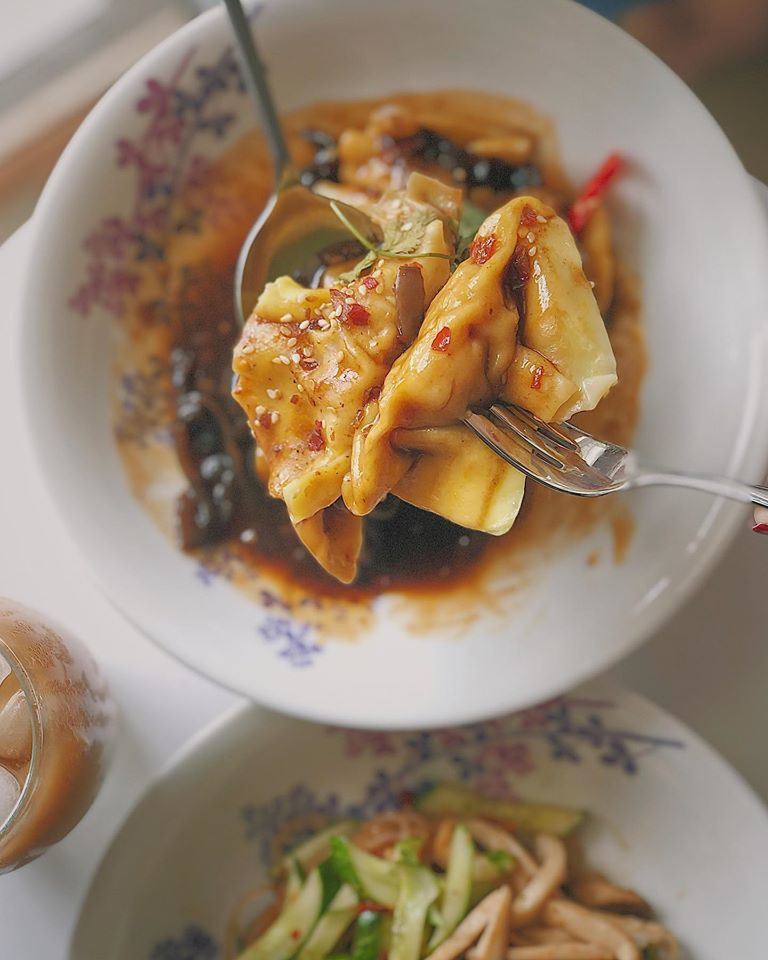 Nhưng nếu bạn muốn ăn trưa hoặc tối, tiệm cũng sẵn phòng phục vụ bạn. Thực đơn cho bữa chính khá phong phú và hấp dẫn: Mỳ Ý (Mỳ Ý ở đây chỉ có 2 version: Mỳ Ý sốt bò bằm và mỳ Ý xào bò sốt Tomyum); sủi cảo sốt giấm đen sa-tế (giá 45K với khoảng 10 viên sủi cảo đầy ụ nhân, chắc thịt, ăn cùng nấm mèo và giấm đen chua chua khá bắt vị); hoặc miến trộn phá lấu cay với sợi miến dai, thấm sốt, ăn cùng phá lấu khìa từ tim, tai heo và lưỡi heo…