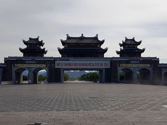 Tại chùa Bái Đính - ngôi chùa lớn nhất Việt Nam cũng có hai cổng Tam Quan khổng lồ đó là cổng Tam Quan nội và Tam Quan ngoại. Trong hình là cổng Tam Quan ngoại được xây dựng cao lớn, ghép bằng đá xanh. Bên dưới cửa cổng nguyên khối được đúc bằng đồng. Du khách mỗi khi đến tham quan chùa, không khỏi choáng ngợp trước cổng chùa lớn nhất Việt Nam này.