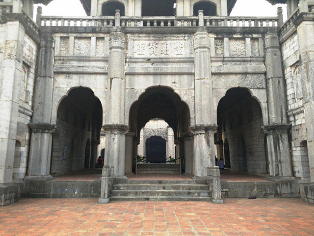 Cổng chào được xây dựng bằng bê tông cốt thép, bên ngoài ốp đá xanh. Bên trên, các lầu mái được xây và ốp gạch và khung gỗ lợp ngói. Mái của cổng chào cũng cong vút lên trời.