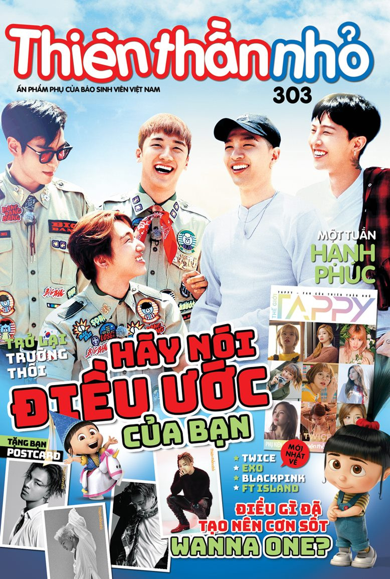 Bật mí cho bạn nè, sở hữu Thiên Thần Nhỏ 303 bạn còn có ngay postcard Taeyang, poster khổ lớn của Wanna One và phụ kiện Thế giới Tappy khổ lớn. Combo hấp dẫn trên có giá chỉ 16.000 đồng, bạn nhớ tìm mua ấn phẩm Thiên Thần Nhỏ 303 tại các sạp báo, bưu điện trên toàn quốc nhé!
