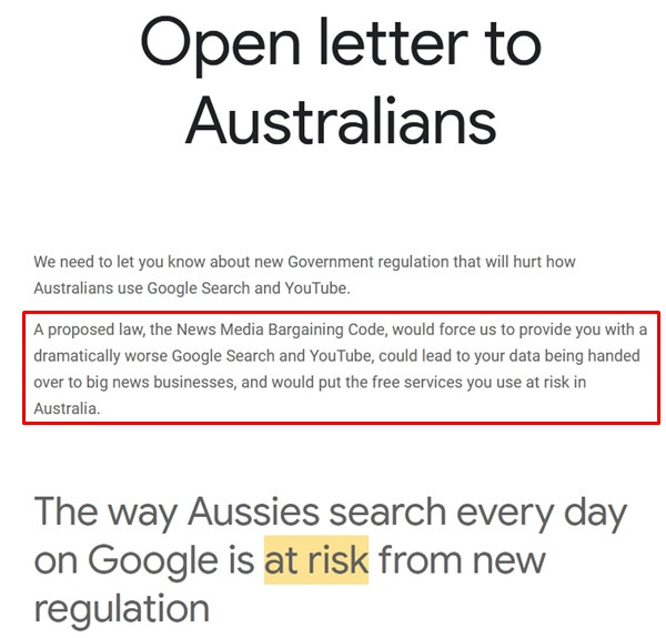 Ngoài Facebook thì trước đó, Google cũng cảnh báo rằng, họ có thể sẽ buộc phải cung cấp những phiên bản Google Search và YouTube “tệ hơn đáng kể”, nếu Chính phủ Úc thực hiện kế hoạch nói trên. Thậm chí, “đại gia” trong lĩnh vực tìm kiếm trên Internet cũng dọa rằng, họ có thể sẽ buộc phải trao nhiều dữ liệu người dùng hơn cho các công ty truyền thông.