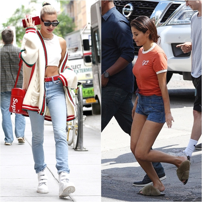 Trong ảnh, hôn thê của Justin Bieber sành điệu với crop top phối quần denim mix cùng áo khoác len Gucci. Trong khi đó, Selena lựa chọn combo áo phông + short jeans đơn giản.