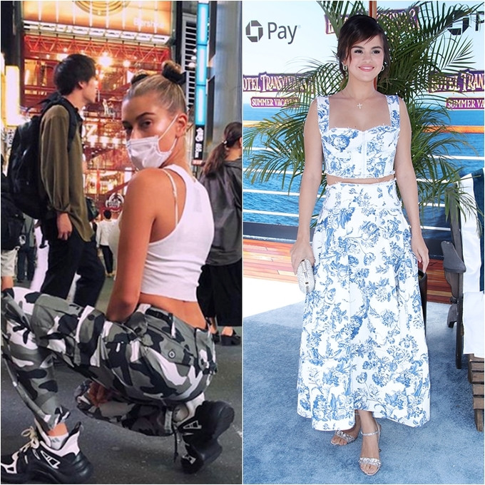 Hailey trung thành với những item casual: tanktop màu trắng + quần jogger họa tiết quân đội cá tính trong chuyến du lịch Nhật Bản. Còn Selena, cô nàng xuất hiện với vẻ ngoài duyên dáng trong bộ đầm hoa đến dự buổi ra mắt bộ phim Hotel Transylvania 3 ở Los Angeles.