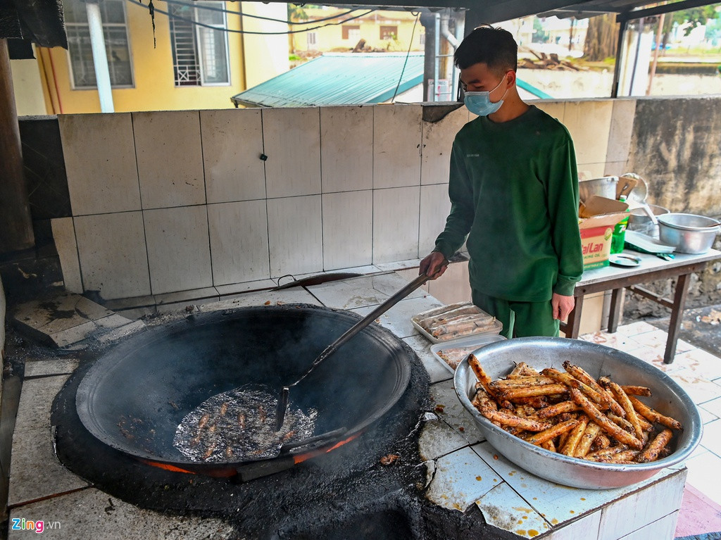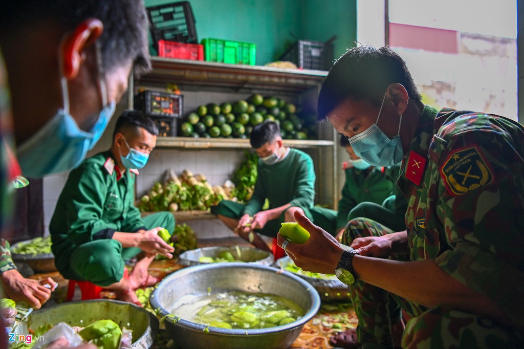 Mỗi ca chuẩn bị đồ ăn đơn vị huy động 15 cán bộ chiến sỹ phục vụ. Thực phẩm đều đợc đảm bảo an toàn trước khi đưa vào chế biến. Mỗi ngày sẽ có ba bữa từ 6h30, 11h và 17h.
