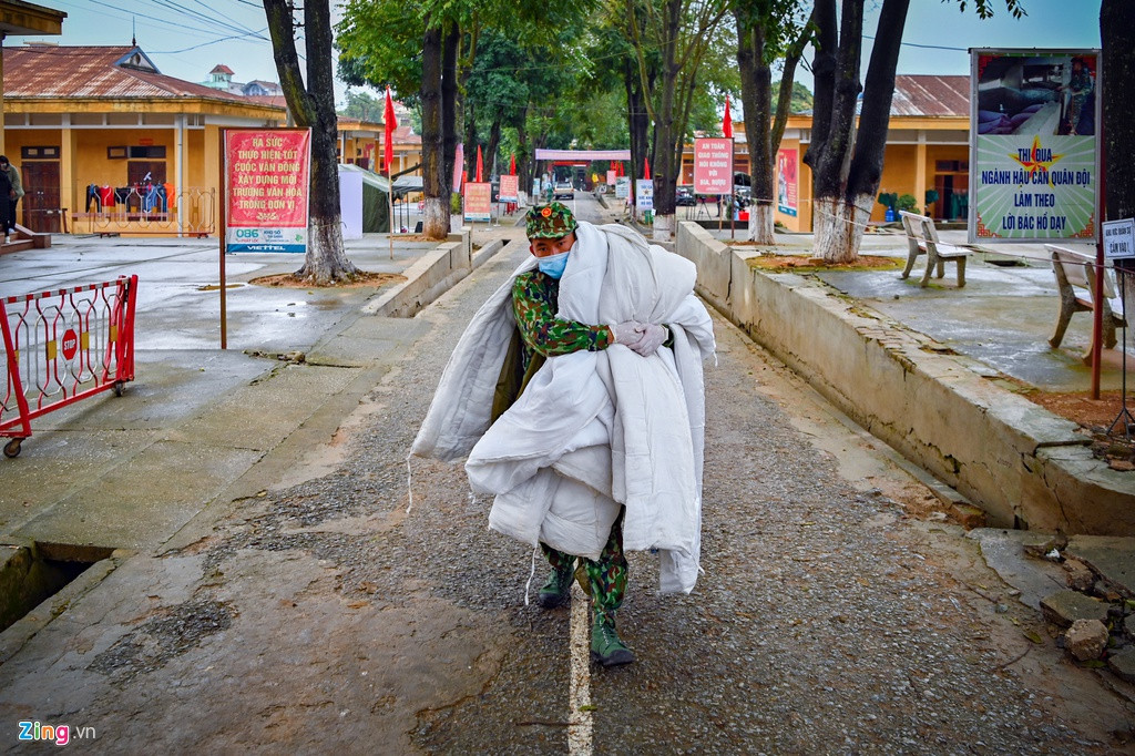 Chị Tâm cùng con gái 2 tuổi trở về từ Trung Quốc sau chuyến thăm người thân đã ở điểm cách ly 3 ngày qua. Chị cho biết con gái được các chiến sỹ nấu thêm 3 bữa cháo mỗi ngày để đảm bảo sức khỏe. "Phòng chúng tôi ở có 8 giường toàn phụ nữ và trẻ nhỏ nên được các chiến sỹ ưu tiên cho thêm bộ đèn sưởi. Nói chung cuộc sống được các anh bộ đội chăm sóc từ miếng cơm thậm chí dọn rác nên mình cảm thấy rất yên tâm khi ở đây".