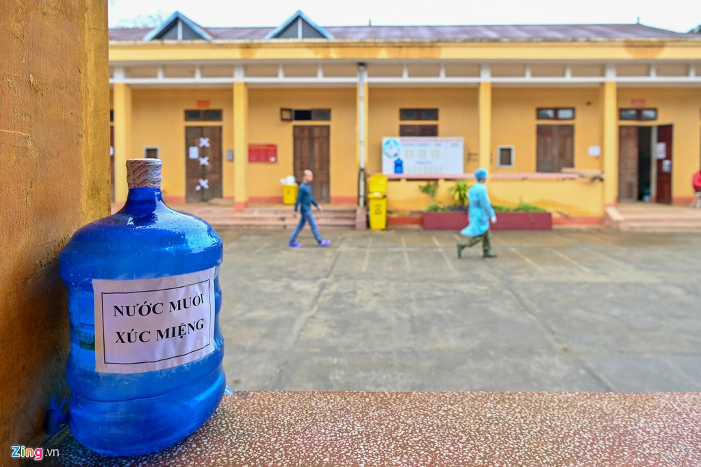 Trước mỗi cửa phòng đều có bình nước muối để mọi người súc miệng.