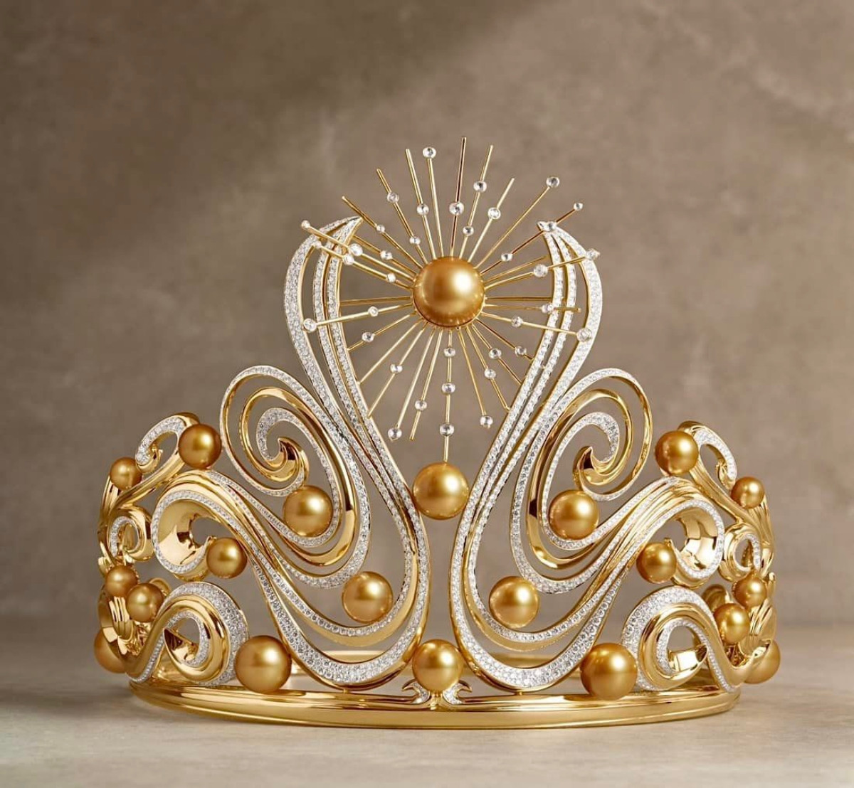 Vương miện này được tạo ra bởi nhà chế tác đồ trang sức nổi tiếng Nhật Bản Tomohiro Yamaji, người muốn làm cho chiếc vương miện trông giống như lông phượng hoàng. Vương miện được làm bằng 18 carat vàng trắng, trang trí bằng 800 viên kim cương và 120 viên ngọc trai.