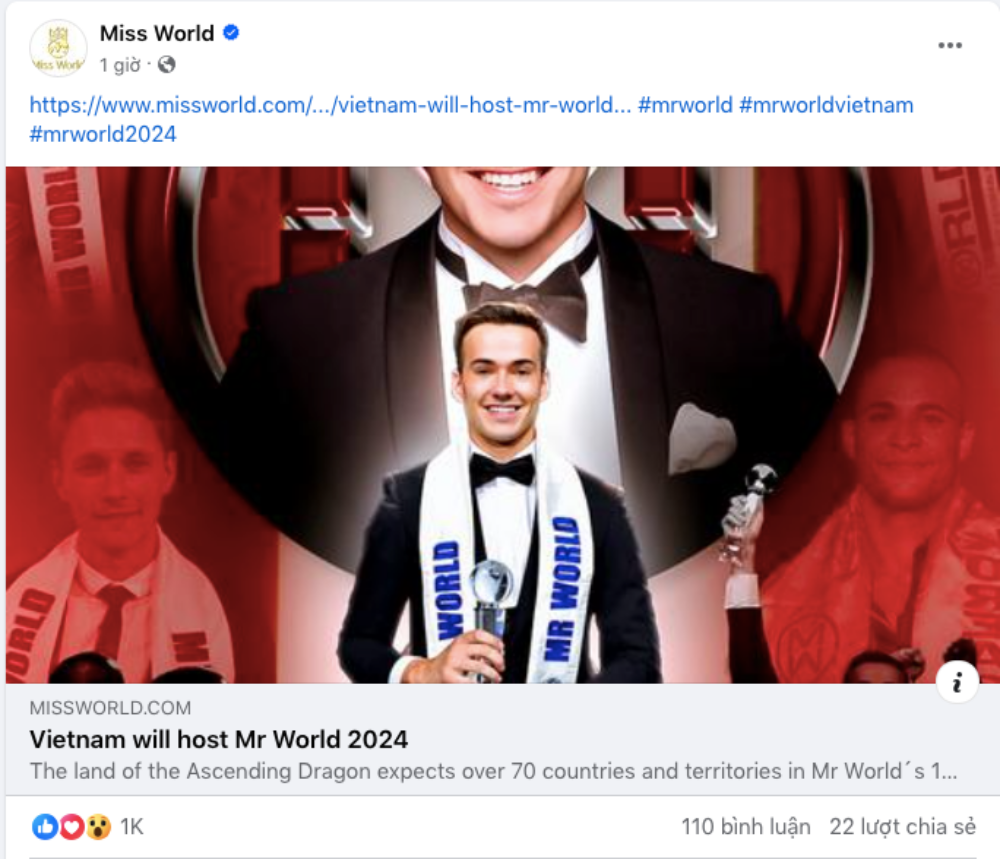 Sau khi xác nhận về việc trở lại sau 4 năm gián đoạn, BTC Mr World (Nam vương Thế giới) đã công bố thông tin trên fanpage chính thức: Việt Nam là chủ nhà đăng cai cuộc thi năm 2024.