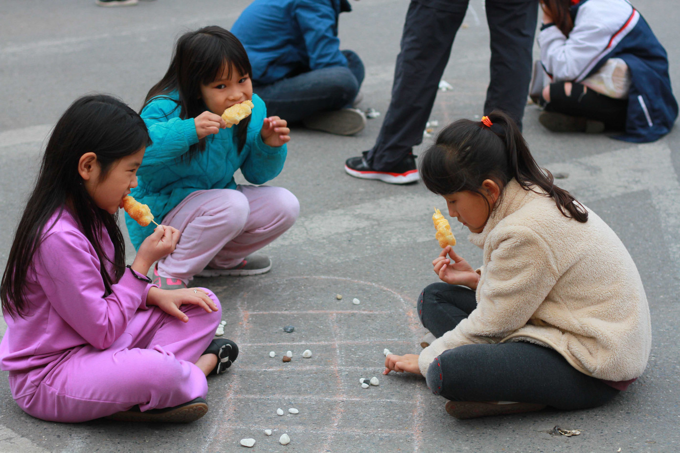 Em Hoàng Anh, 9 tuổi (bên phải) say mê trong lần đầu thử sức với trò ô ăn quan. Em vui mừng khoe lên đây chơi đã quen được bạn mới.