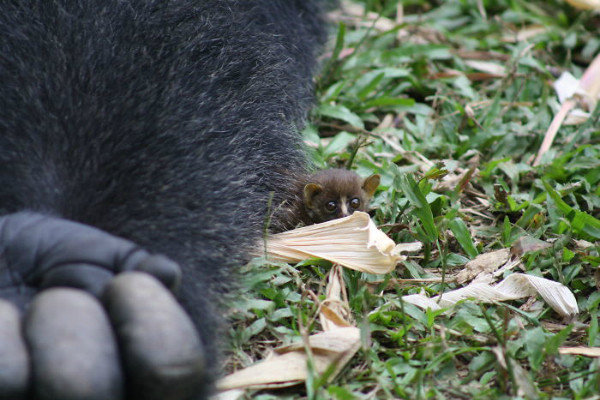 Mới đây, trong một buổi sáng đi kiểm tra, người chăm sóc đã vô cùng ngạc nhiên khi thấy Bobo đang chơi đùa, cưng nựng chú vượn Galago - một loài vượn cáo nhỏ ở châu Phi có mắt to, đuôi dài.