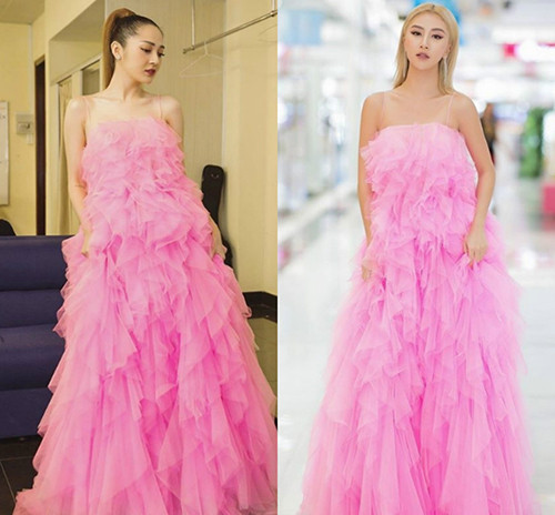 Hà Hồ vốn theo đuổi phong cách thời trang đơn giản, gợi cảm nhưng gần đây cũng mê mệt đầm công chúa. Nữ ca sĩ diện hai chiếc váy xếp bồng màu hồng như bước ra từ cổ tích.