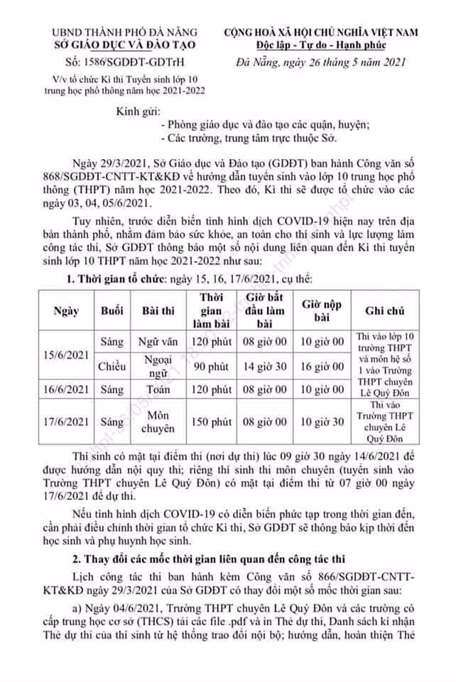 Tối 26/5, Sở Giáo dục và Đào tạo (GD&ĐT) thành phố Đà Nẵng ban hành công văn về việc tổ chức kỳ thi tuyển sinh lớp 10 Trung học phổ thông (THPT) năm học 2021 - 2022. Theo đó lịch thi sẽ được lùi lại thay vì tổ chức vào các ngày 3, 4, 5/6/2021 như hướng dẫn trước đó ban hành ngày 29/3.