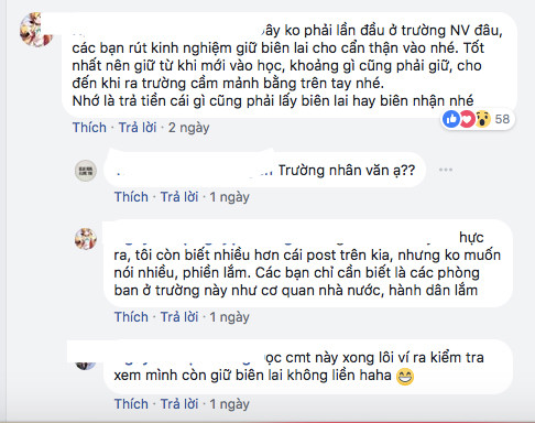 Sau chia sẻ này, nhiều sinh viên khác cũng bày tỏ sự hoang mang trong cách thu học phí của nhà trường. Một số lo lắng vì nếu trong trường hợp bị mất biên lai đã đóng tiền trước đó liệu có phải đóng lại tiền hay không.