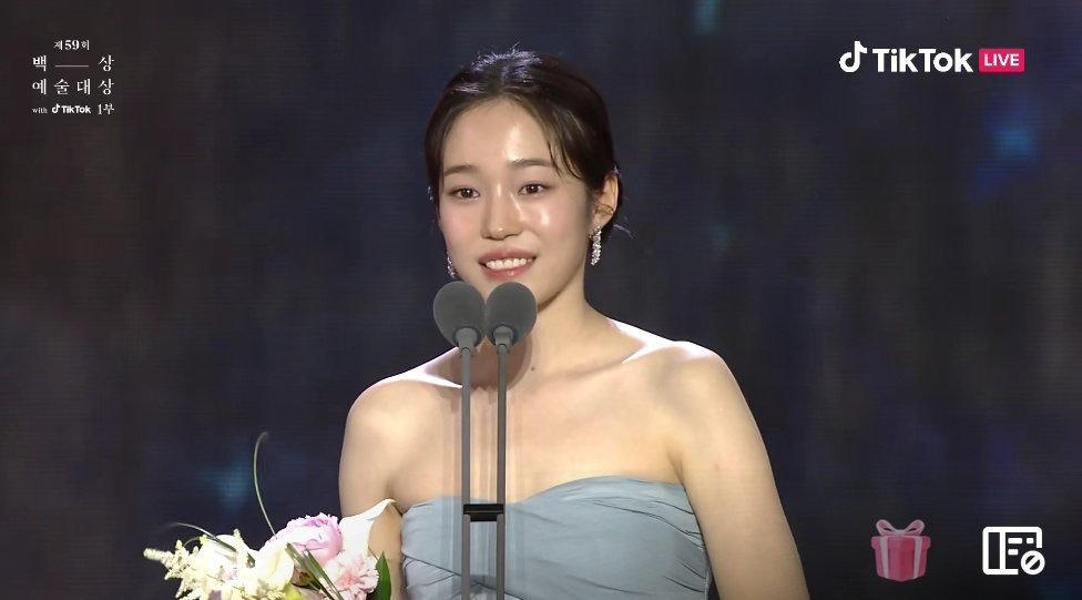Sự xuất hiện của dàn sao đình đám đã biến lễ trao giải Baeksang lần thứ 59 trở thành đại tiệc nhan sắc. Khung hình chung được máy quay vô tình lướt qua khi đang dõi mắt lên sân khấu của Song Hye Kyo và Jinyoung (GOT7) đang gây sốt mạng xã hội Twitter. Nhan sắc thách thức thời gian của Song Hye Kyo và vẻ ngoài lịch lãm của Jinyoung "đánh bùa choáng" người xem.
