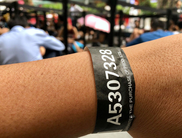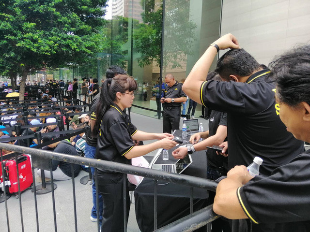 Nhân viên tại Apple Store cũng đã đeo vòng tay chứa mã số cho từng người xếp hàng để tiện trong việc quản lý và thống kê số lượng người đến xếp hàng vào lúc 12h cùng ngày.